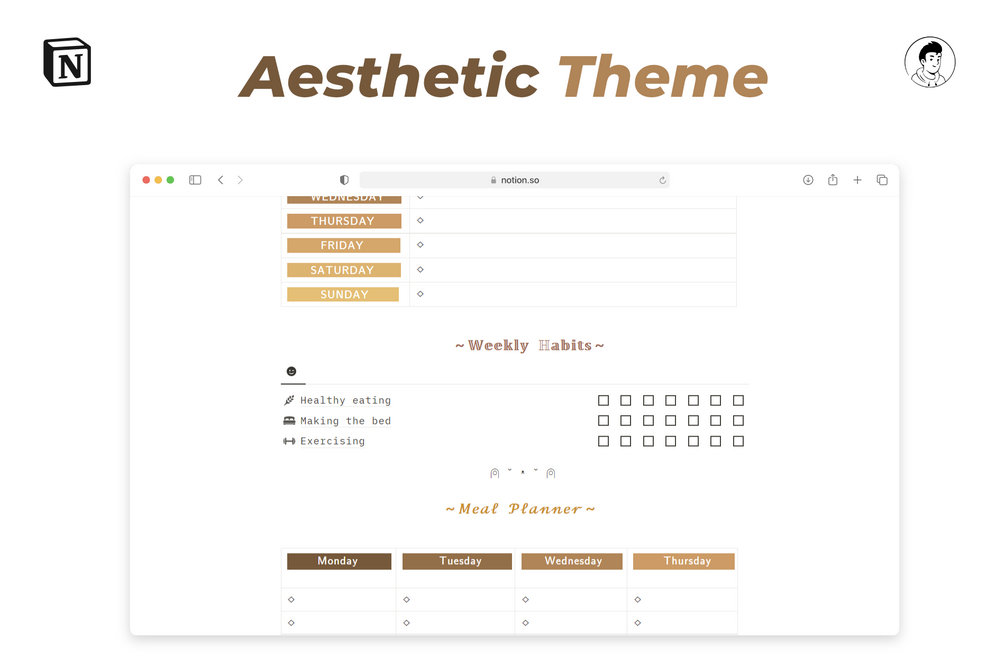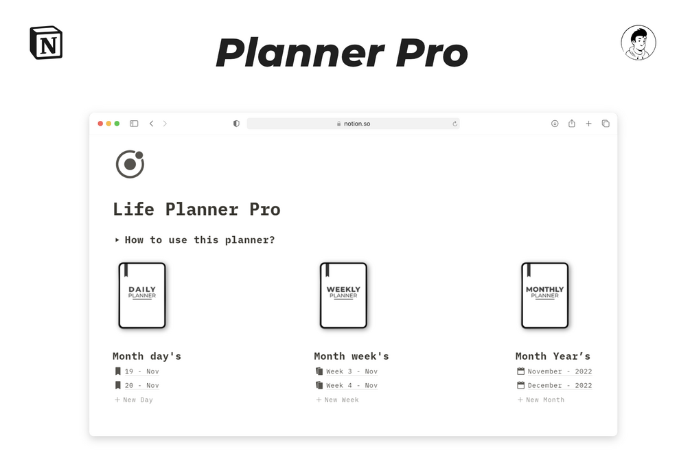 Keep your day organized with this Notion template. Get a daily, weekly and monthly organizer, to keep control of your life, with advanced features, so you can keep all your days in a very organized way.