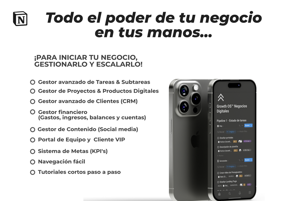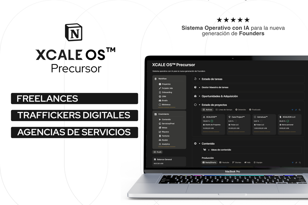 - XCALE OS en Notion: Un hub único para gestionar clientes, proyectos, tareas, finanzas, contenido y productos digitales, todo conectado en un solo panel.