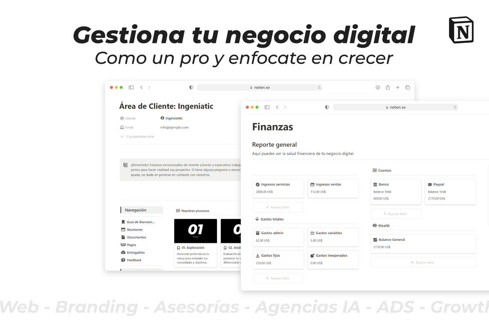 Sistema en Notion diseñado para Freelancers, Traffickers y Agencias, que ya facturan, pero están atrapados en el caos operativo y quieren construir un negocio que funcione sin depender de ellos todo el tiempo.